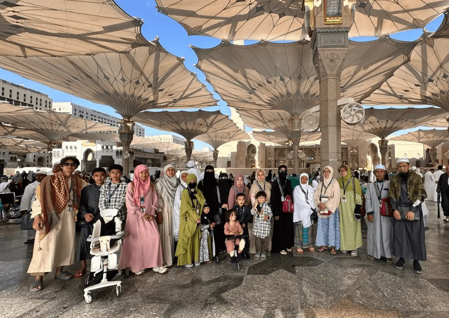 Jika ada jamaah yang membutuhkan kursi roda, kami siap menyediakan tanpa biaya tambahan (tidak termasuk pendorong)